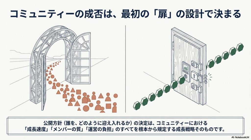 公開方針とは、一言で言えば「コミュニティの扉をどの程度開けておくか」という設計図です。これは単なる技術的な参加設定ではありません。その場所の「第一印象」や「空気感」、そして集まる人々の振る舞いを決定づける、コミュニティの心臓部ともいえる意思決定なのです。