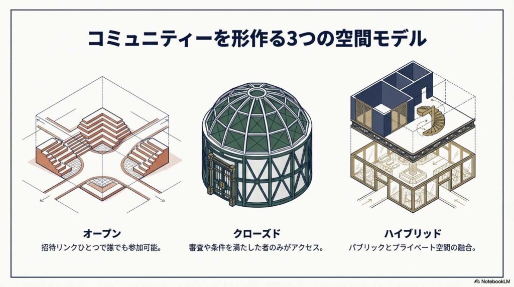 このガイドでは、あなたが理想とするコミュニティに最適な「入り口」を選べるよう、3つの基本モデルを紐解いていきます。