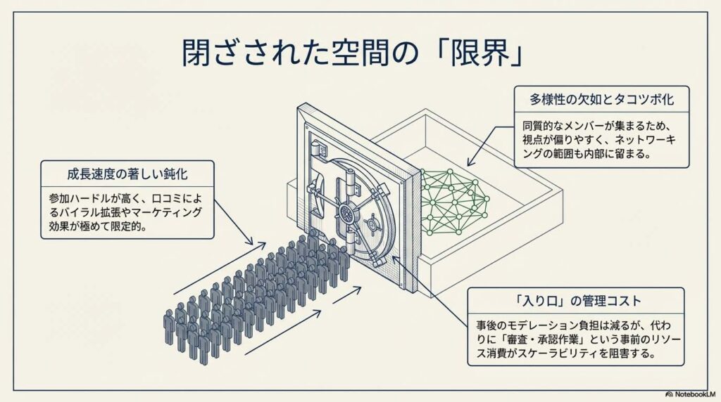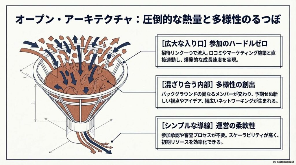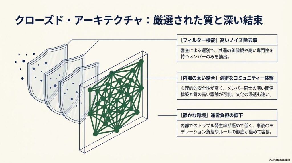 「オープン型」のアーキテクチャは、参加コストを極限まで下げることで、口コミによる指数関数的な成長と、広範なマーケティング・リーチを可能にします。しかし、その代償としてスパムや荒らしといった外部ノイズの影響を直接的に受け、メンバーの質に致命的なばらつきが生じます。