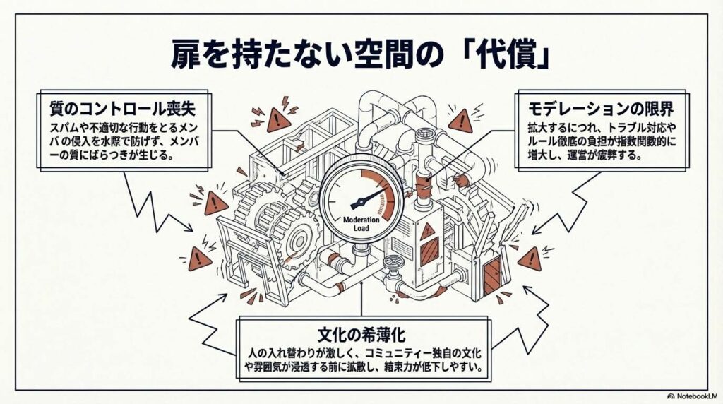 審査や承認プロセスを排除したオープン型コミュニティは、一見すると「フロントエンドの摩擦」がないため効率的に見えます。しかし、その実態は**「リアクティブなモデレーション(監視・対応)」**に膨大なリソースを浪費し続ける構造です。不適切な行動やトラブルへの事後対応に忙殺され、戦略的なコミュニティ発展に割くべきリソースが枯渇していくのです。