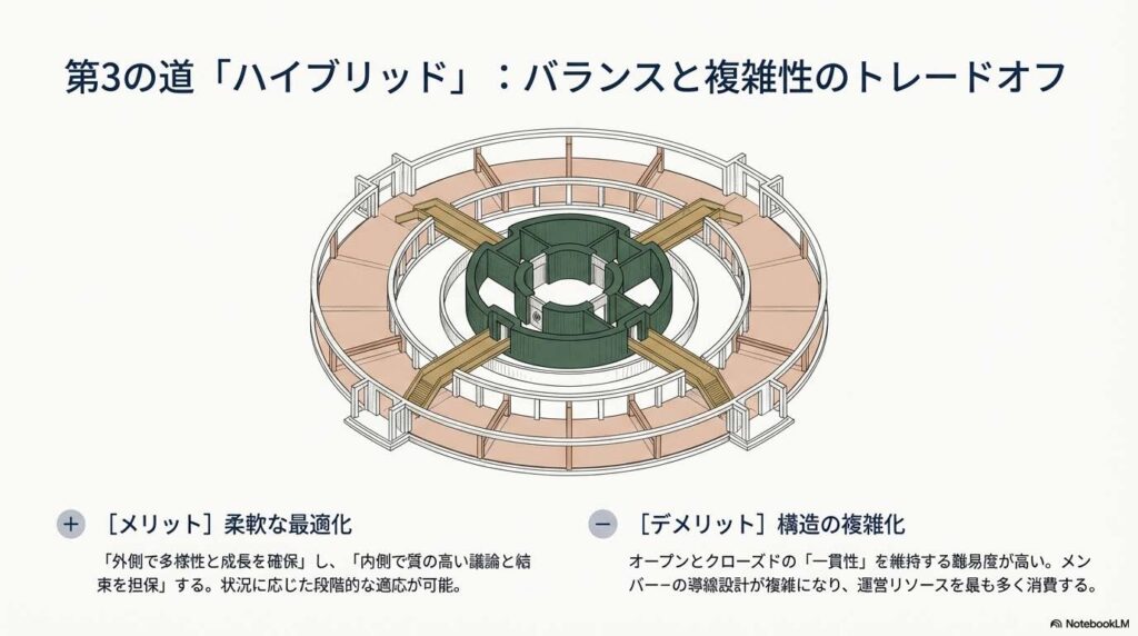 成長の爆発力と文化の純度、この二項対立を解消する「戦略的建築物」がハイブリッド型です。これは、オープンな流入経路とクローズドな深化プロセスを共存させる手法であり、コミュニティの適応力を最大化します。
