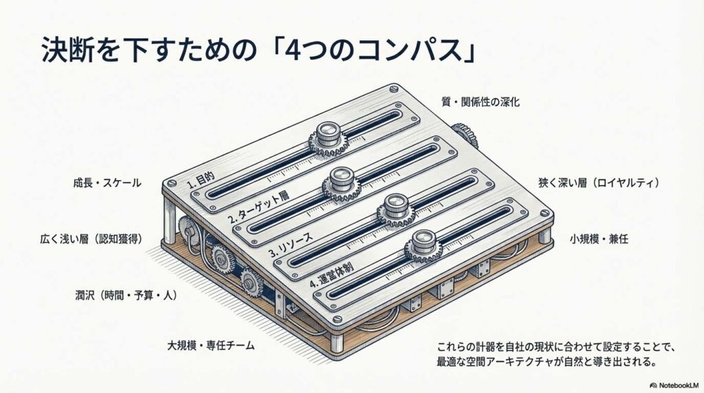 - 回答: 「コミュニティーの目的(成長か質か)」、「ターゲット層(広さか深さか)」、「利用可能なリソース(時間・人材・予算)」、「運営体制(規模と柔軟性)」の4つが基準となります。