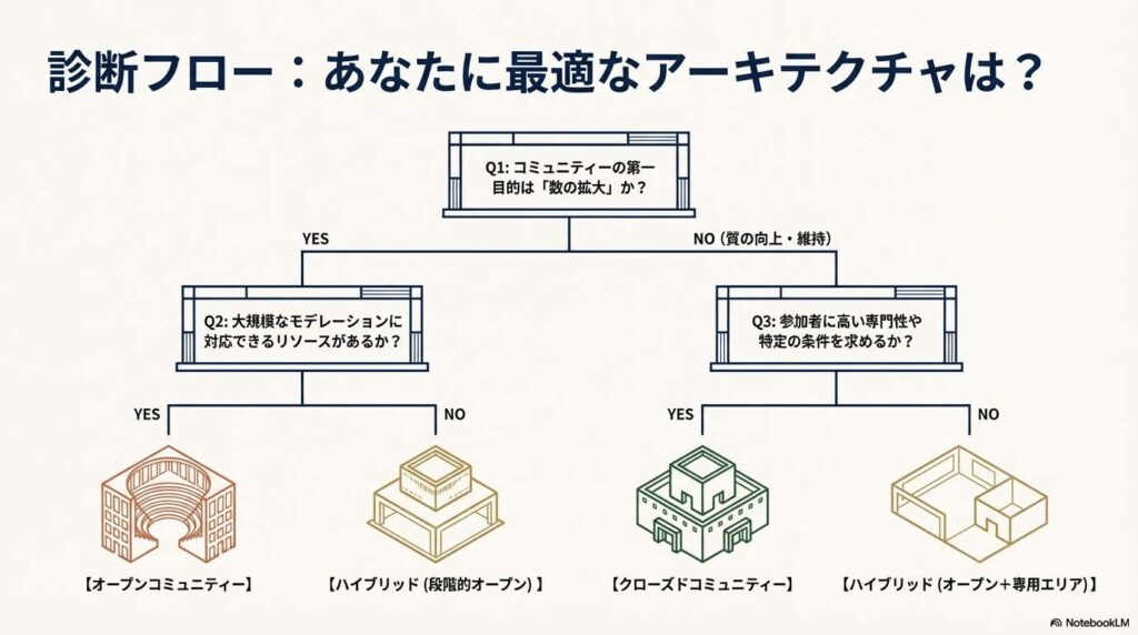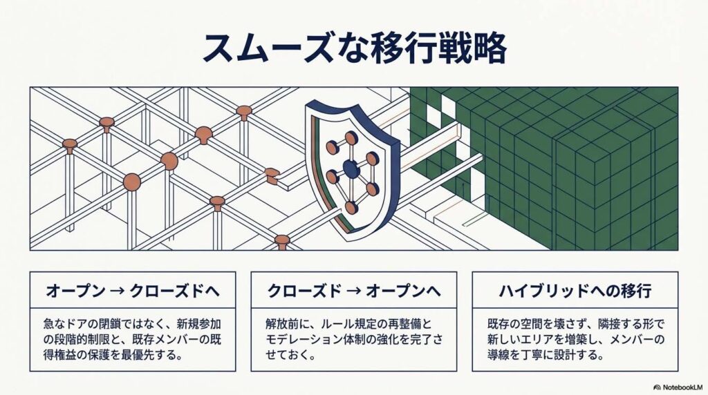 ソースが強調するように、移行において最も重要なのは「段階的な移行」というプロセスです。オープンからクローズドへ舵を切る際は「既存メンバーの保護」を最優先事項とし、クローズドからオープンへ広げる際は「モデレーション体制の強化」という防衛線を事前に構築することが不可欠です。