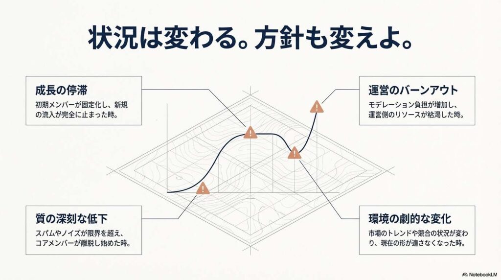 - メンバーの質の低下や運営負担の増加が、コミュニティの維持限界を超え始めたとき(オープンからクローズド、またはハイブリッドへ)。