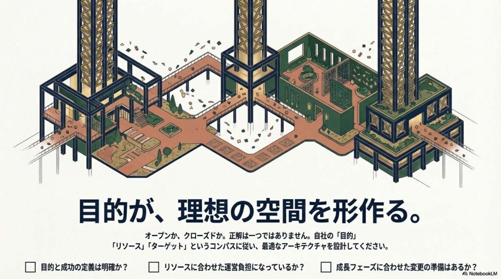 オープンがもたらす「外向的なエネルギー」と、クローズドが育む「内向的な結束」。どちらが優れているかという議論に正解はありません。あるのは、あなたが描く未来のビジョンに対して、その設計が論理的に整合しているかという一点のみです。