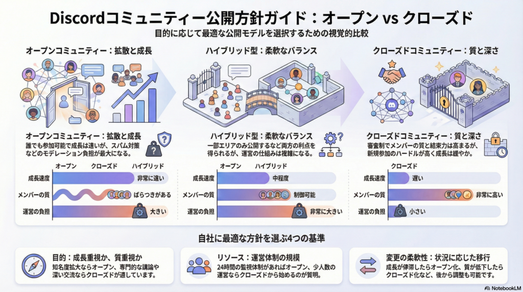 本ガイドは、Discordコミュニティを立ち上げ・運営する際の「公開方針」に焦点を当て、各モデルの特徴、利点、欠点、および選定基準を網羅的に解説したものです。